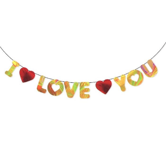 Vier de liefde met elkaar met deze I Love You slinger met een glimmende, metallic afwerking. De slinger dient nog zelf in elkaar geregen te worden met het bijgeleverde lint en rijgnaald.