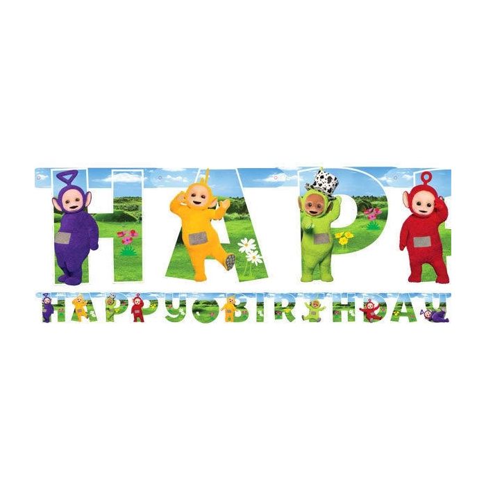 Teletubbies "Happy Birthday" slinger, een feestelijke versiering voor het verjaardagsfeest van je dreumes of peuter! Op de slinger kan de leeftijd worden toegevoegd aan de hand van de cijfer stickers (0 t/m 9) die worden meegeleverd. De slinger heeft een afmeting van ongeveer 14 x 160 cm.