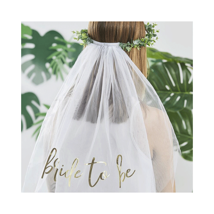 Mooie botanische kroon van eucalyptus met witte sluier met daarop een goudkleurige Bride To Be print. Speciaal voor de aanstaande bruid tijdens haar vrijgezellenfeest. De slinger is 63,5 x 70 cm groot.