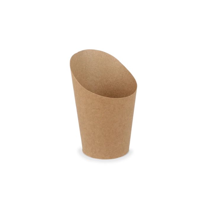 Ontdek de duurzame kraft snackcup, perfect voor kleine porties friet en wraps. Met een (onder)diameter van 6 cm en een hoogte van 11,5 cm is deze snackcup ideaal voor onderweg. Het gebruik van natuurlijke papierpulp zorgt voor de bekende bruine uitstraling van de kraft kartonnen snackbeker. Het is volledig vrij van plastic en elke verpakking bevat 24 snackbekers.