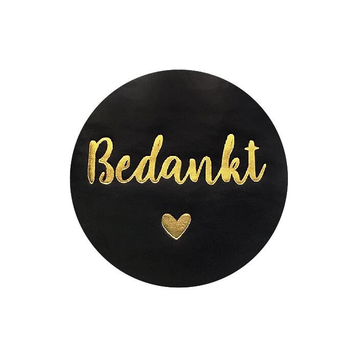 Zwarte ronde stickers met de tekst 'Bedankt!' en een hartje in goudfolie. De stickers hebben een doorsnede van 3cm. Eén verpakking bevat 24 stickers.