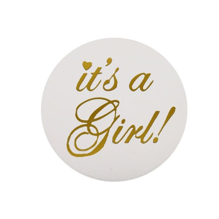Kleine ronde stickers met gouden tekst "It's a Girl!". Leuk om op een bedankje te plakken! De stickers hebben een doorsnede van 3 cm. In een verpakking zitten 24 stickers.
