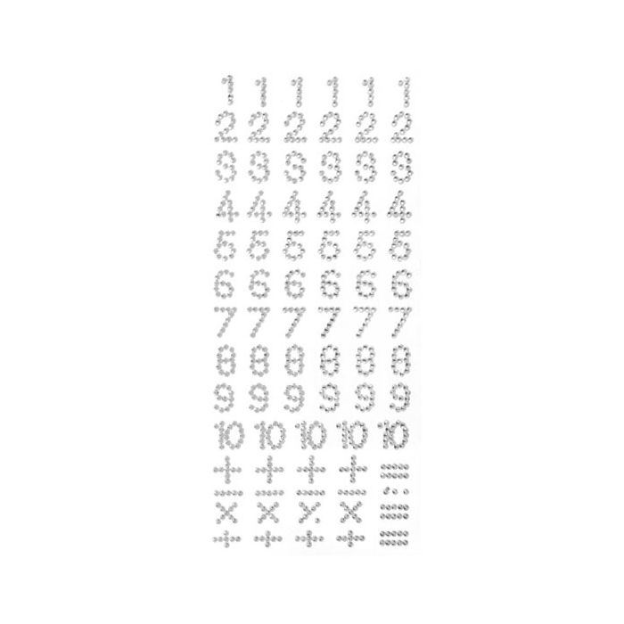 Strass cijfers stickervel in diverse kleuren verkrijgbaar. Eén stickervel bevat 84 strass cijfers. De letters hebben een afmeting van ongeveer 1 x 1,1 cm.