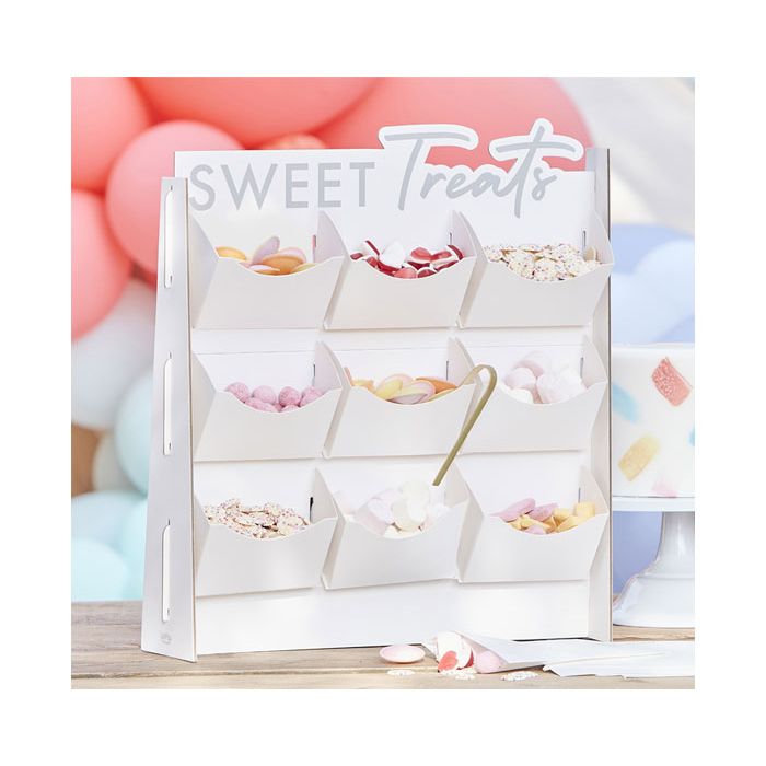 Maak indruk op je gasten met deze fantastische traktatiestandaard, je feesttafel heeft er nog nooit zo goed uitgezien! Deze zoete tafelstandaard is 47,4cm (H) x 42,1cm (B) en wordt compleet geleverd met 9 traktatieplanken, 10 traktatiezakjes en 1 tang.