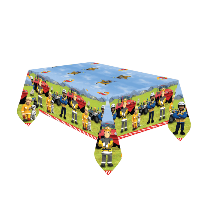 Papieren tafelkleed met brandweerman Sam. De tafelkleed heeft een afmeting van 120x180cm.