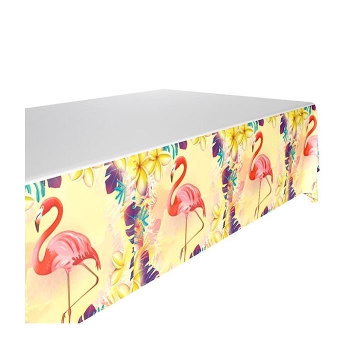 Vrolijke plastic tafelkleed met een opdruk van een flamingo. De tafelkleed heeft een formaat van 108x180cm.