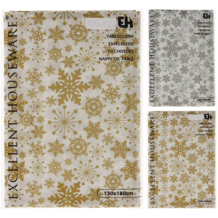 Witte tafelkleed van flanel bedrukt met gouden sterren. De tafelkleed heeft een afmeting van 130x180cm. Perfect voor de feestdagen.