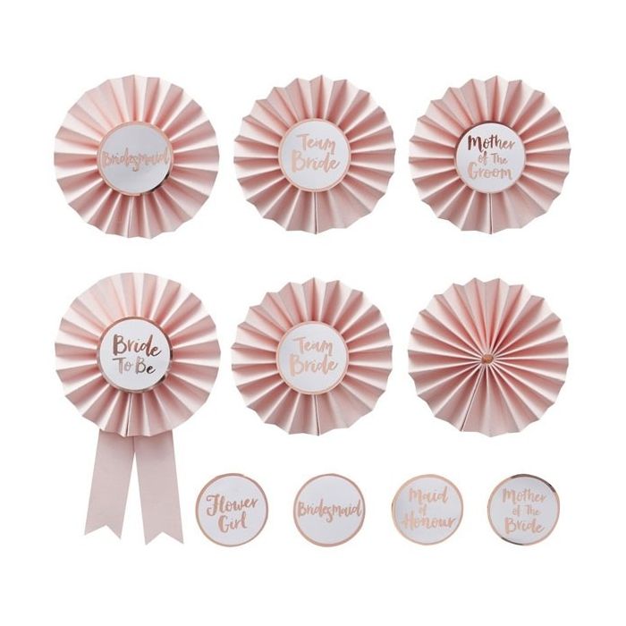 Het is BACHELORETTE PARTY time! Deel de rozetjes uit aan alle meiden en draag deze op je kleding zodat iedereen weet dat TEAM BRIDE vandaag een feestje viert! De kit wordt geleverd met roségouden stickers met de volgende titels: Bride to be, Flower Girl, Mother of the Bride, Mother of the Groom, Maid of Honour, Bridesmaid en Team Bride. De set bestaat uit 6 badges (9 stickers). De badges zijn 8 cm groot.