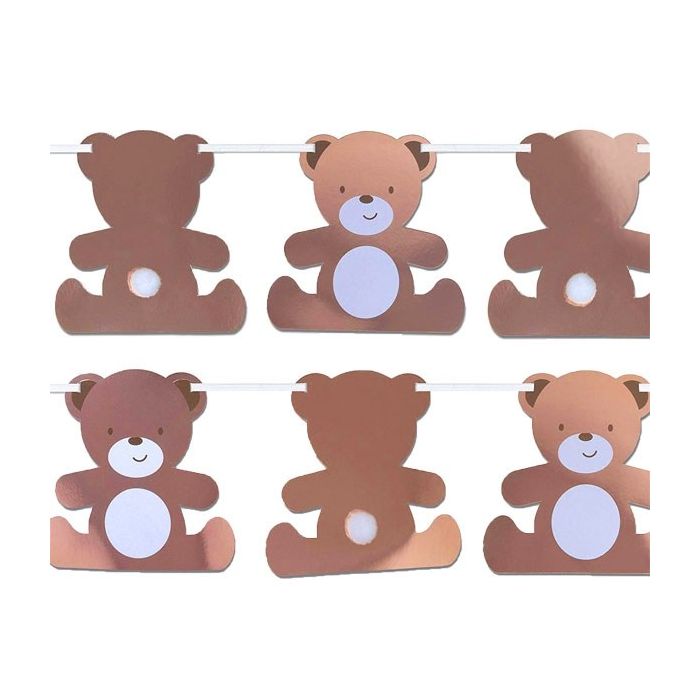 Papieren teddy beer slinger. Eén verpakking bevat 8 papieren beertjes, 8 pompom bollen, gouden satijnen lint van circa 2,8m, tape en een rijgnaald. Let op: de slinger wordt niet in elkaar geregen geleverd!
