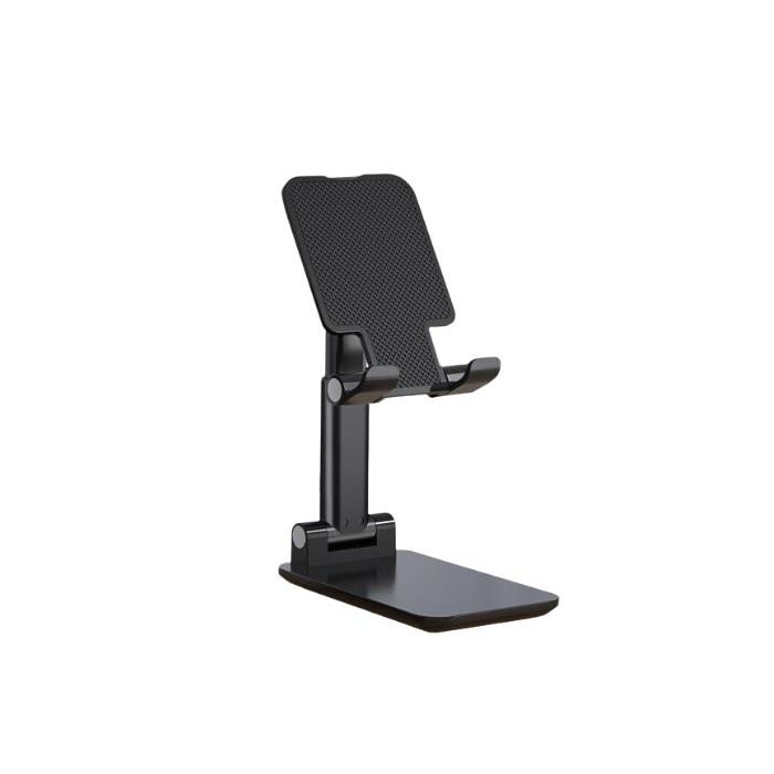 Opvouwbare en uitschuifbare telefoonstandaard in zwarte kleur.