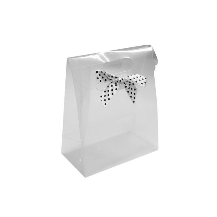 Transparante PVC cadeautasjes. Achter het strikje is een klittenbandje bevestigd om het tasje dicht te maken. De tas heeft een afmeting van 9,5x5x11,5cm (LxBxH). Een verpakkign bevat 12 tasjes.
