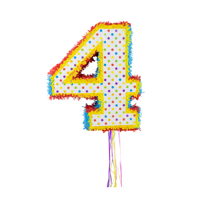 Vrolijke piñata in de vorm van het cijfer 4, is 49x39x9,5cm (HxBxD) groot. De pinata wordt leeg geleverd en kan worden opgevuld met kleine presentjes en snoepgoed. Door aan de linten te trekken, vallen deze kleine presentjes eruit.