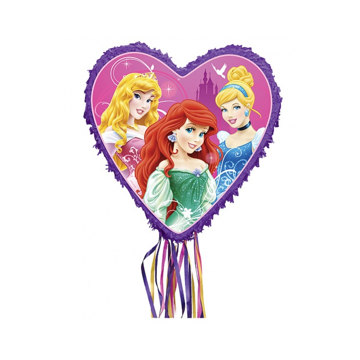 Hartvormige pinata met de Disney prinsessen Assepoester, Ariel en Doornroosje. De pinata is 4 x 43,4 x 8,3 cm groot. De pinata heeft een opening van 4 x 4 cm waardoor de pinata makkelijk te vullen is met snoepgoed of kleine speeltjes. Door te trekken aan de krullinten vallen de presentjes eruit.