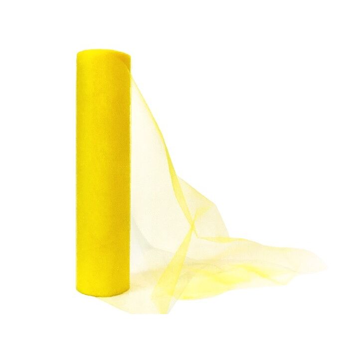 Gele tule op rol. Voor het maken van mooie strikken en/of versieren van bijvoorbeeld stoelen en tafels. Op een rol zit 18 meter tule en is 30 cm breed. Let op: daadwerkelijke kleur kan een beetje afwijken van de foto!