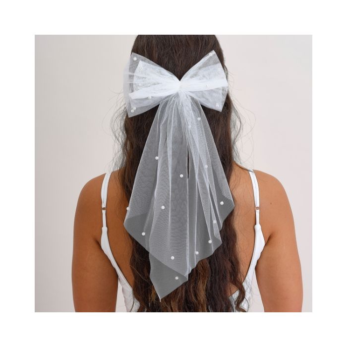 Elk pakket bevat: 1 x witte tule strik met parelversieringen, afmeting 46 cm (L)
