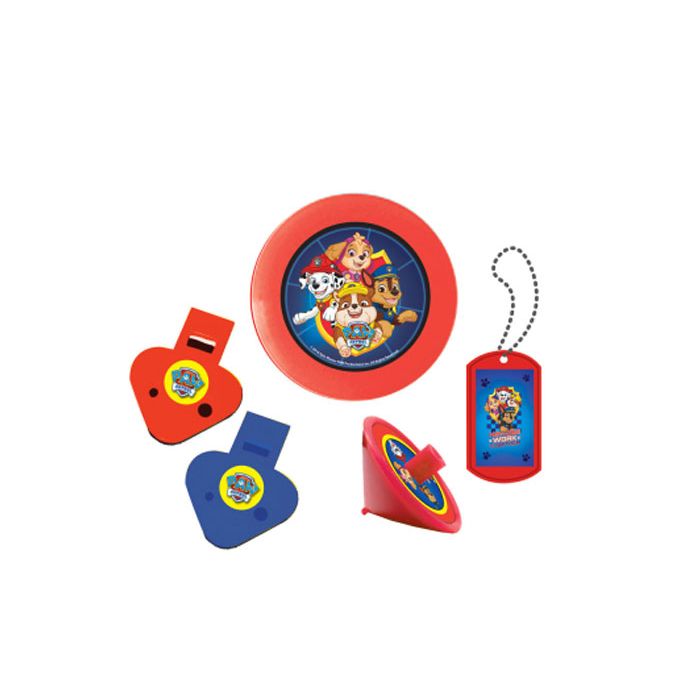 Set van 24 kleine Paw Patrol uitdeel cadeautjes. Je kunt ze bijvoorbeeld gebruiken voor in de Paw Patrol uitdeelzakjes. De set bevat vier verschillende cadeautjes. Een tol, dogtag ketting, mini frisbee en fluitje. Van elke cadeautje zitten er zes stuks in de set.