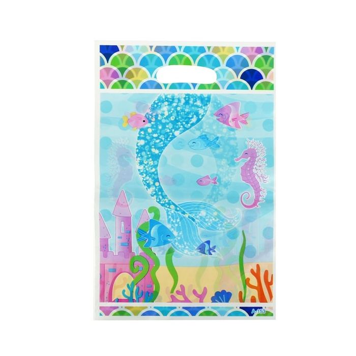 Kleurrijke uitdeelzakjes met zeemeermin en onder de zee-thema. De zakjes zijn aan beide kanten bedrukt en hebben een afmeting van 16,5 x 25 cm. Een verpakking bevat 12 zakjes.