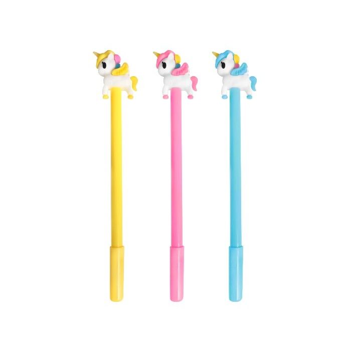 Softplastic unicorn pennen met een fijne blauwe punt. De pen is 18,5 cm lang. Een pak bevat 4 pennen. De kleuren van de pennen kunnen per pak verschillend zijn.