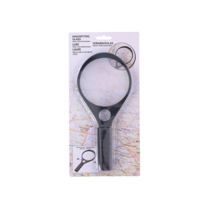 Deze grote vergrootglas is ideaal voor het lezen van kaarten. De grote lens vergroot drie keer en de kleine lens vier keer.