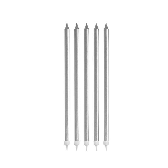 Zilveren verjaardagskaarsen. De kaarsjes zijn 11 cm lang en verpakt per 6 stuks