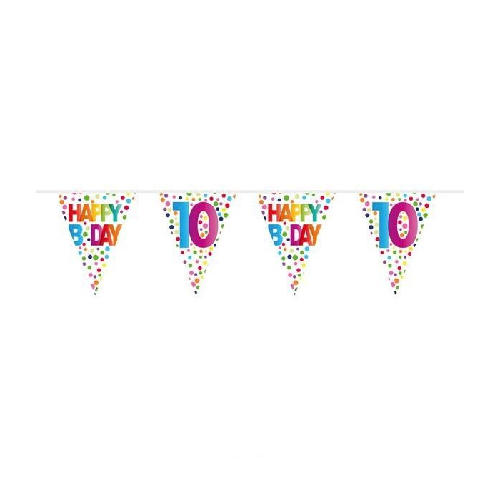 Feestelijke 10 jaar vlaggenlijn . De vlaggenlijn is 10m lang en de vlaggetjes hebben een lengte van 27cm. Op een vlaggenlijn hangen 15 vlaggetjes.