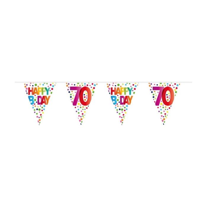 Feestelijke 70 jaar vlaggenlijn . De vlaggenlijn is 10m lang en de vlaggetjes hebben een lengte van 27cm. Op een vlaggenlijn hangen 15 vlaggetjes.