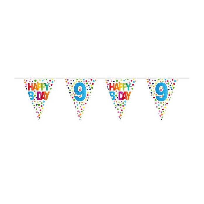 Feestelijke 9 jaar vlaggenlijn . De vlaggenlijn is 10m lang en de vlaggetjes hebben een lengte van 27cm. Op een vlaggenlijn hangen 15 vlaggetjes.