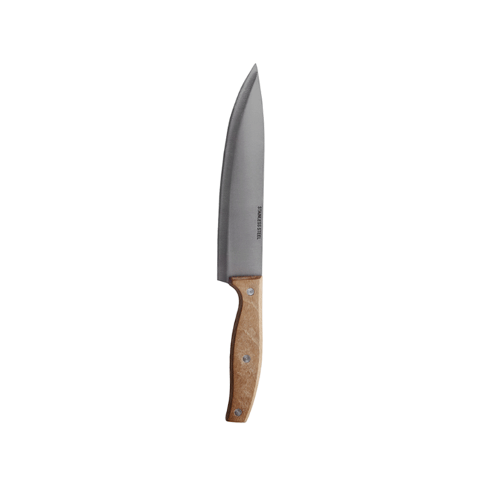 RVS vleesmes met houten handvat. Lengte: 33 cm.