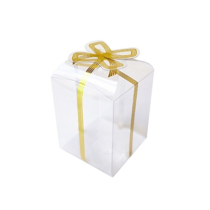Transparante vouwdoosjes bedrukt met gouden lijnen en een strik aan de bovenkant. Eén verpakking bevat 12 doosjes. Eén doosje is 6,5x6,5x8cm groot.