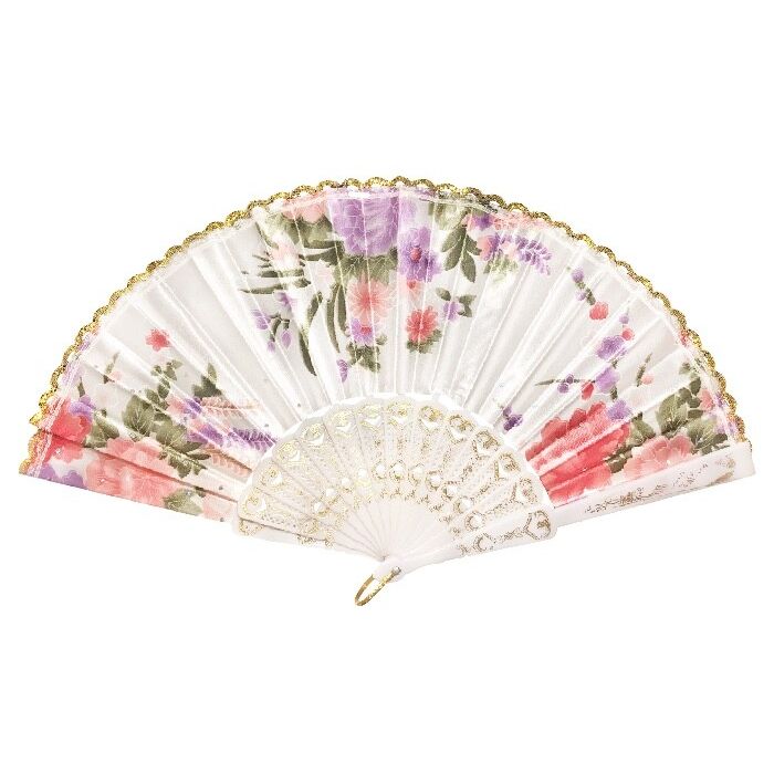Satijnen waaier met bloemenprint in het wit. De frame van de waaier is van plastic. De waaier is 23 cm lang.