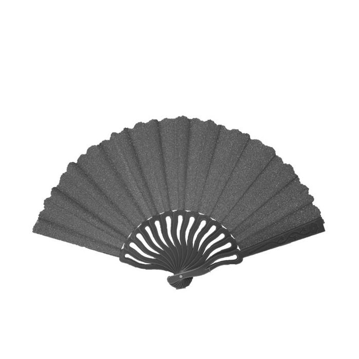 Papieren glitter waaier in de kleur zwart. De frame van de waaier is van plastic. De waaier is 23 cm lang.