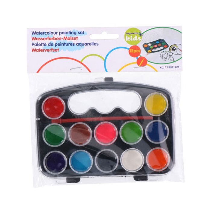 Waterverf set voor kinderen. 12 kleuren in een afsluitbaar doosje en een kwastje.