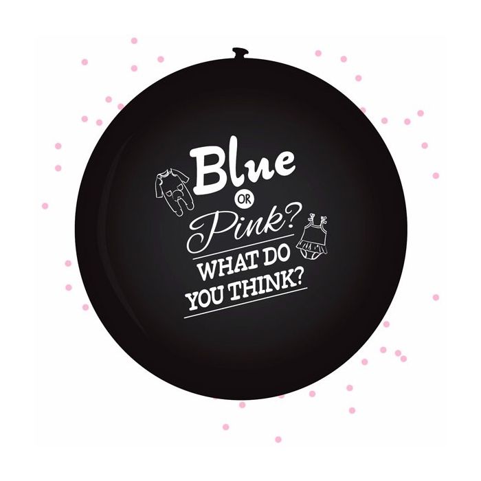 XL zwarte ballon met de tekst 'Blue or Pink? What Do You Think?' gevuld met roze confetti. Organiseer je een Gender Reveal Party? Dan mag deze ballon niet ontbreken! Prik de ballon kapot met een speld en er komt roze confetti uit!