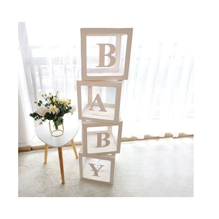 Grote BABY decoratie blokken in het wit. Je kan de blokken bij de ingang, sweet table of cadeautafel plaatsen. Een echte eye-catcher op een babyshower, gender reveal of geboortefeest. De set bestaat uit 4 dozen transparante vlakken en losse letters BABY. De letters dienen nog zelf aan de doos bevestigd te worden. Dit kan bijvoorbeeld met lijm of tape. De dozen worden plat geleverd en zijn gemakkelijk in elkaar te zetten.