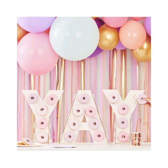 Deze YAY donut standaard zal het middelpunt van je feestje zijn en biedt ruimte voor 17 donuts. Je zet de donut standaard eenvoudig zelf in elkaar. Elke verpakking bevat 3 letters van 23,5 (b) x 40 (h) cm groot.
