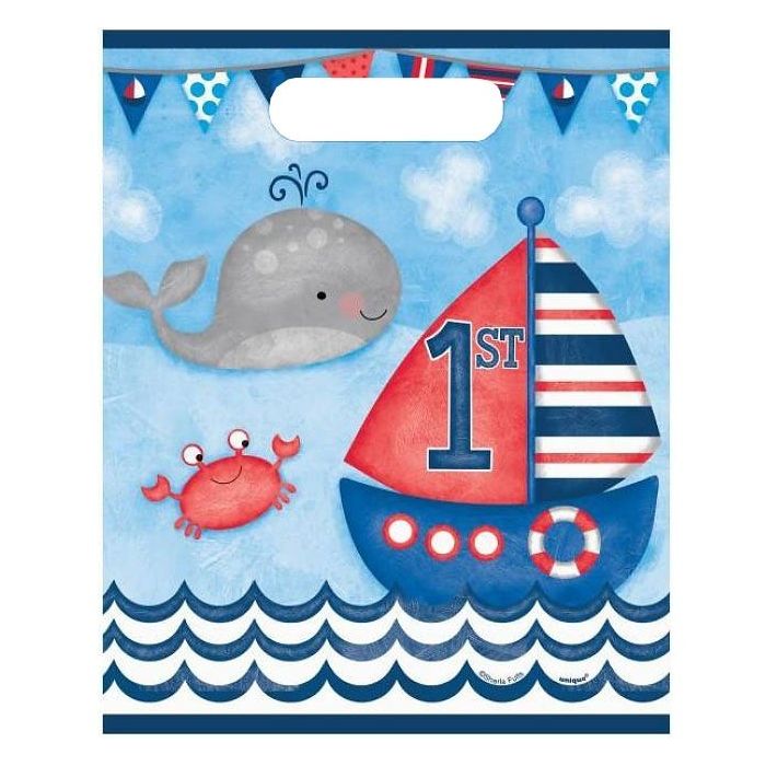 Plastic uitdeelzakjes van '1st Birthday Matroos'. Op de zakjes vind je terug de zee, anker, krab en walvis. Perfect voor een schattige eerste verjaardagsfeestje van je zoon met een nautisch thema! De zakjes zijn 18,8 x 22,6 cm groot en zijn verpakt per 8 stuks.