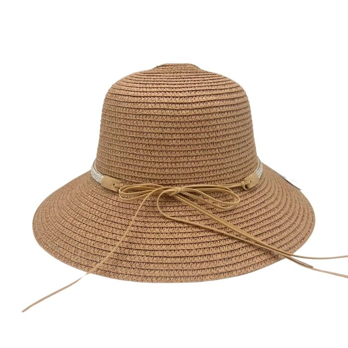 Elegante zomerhoed van stro met een aflopende rand voor dames. Deze bruine hoed is versierd met kleine strass steentjes. Naast het bieden van bescherming tegen de zon, voegt de hoed ook een vleugje elegantie toe aan elke zomerse outfit. Perfect voor een dagje aan het strand, een tuinfeest of een ontspannen wandeling in het park. Combineer deze hoed met een luchtige jurk en sandalen voor een moeiteloos chique uitstraling.