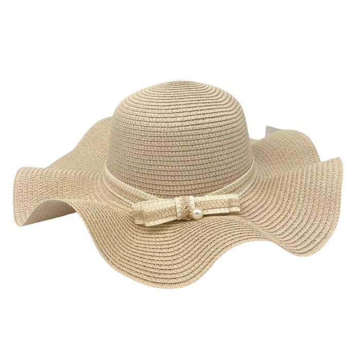 Elegante zomerhoed van stro met een golvende rand voor dames. Deze beige kleurige hoed is versierd met een strik en een parel. Naast het bieden van bescherming tegen de zon, voegt de hoed ook een vleugje elegantie toe aan elke zomerse outfit. Perfect voor een dagje aan het strand, een tuinfeest of een ontspannen wandeling in het park. Combineer deze hoed met een luchtige jurk en sandalen voor een moeiteloos chique uitstraling.